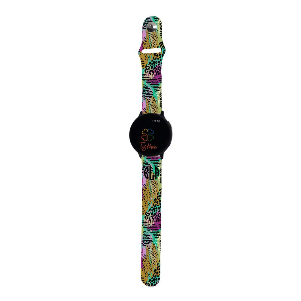 Nothing screams fun more than a Safari Leopard print! Compatible with the Samsung, Garmin, Verizon Gizmo, and other watches using 20mm band. This Personalized Safari Leopard Band will become your new favorite watch band. Made with high-quality silicone, this watch band is adjustable, comfortable, and super cute. It can be customized in any leopard print pattern and color of your choice. Whether you want a plain blue-colored strap with black spots for work or a funky colorful band for a night out, there are a variety of options to choose from.