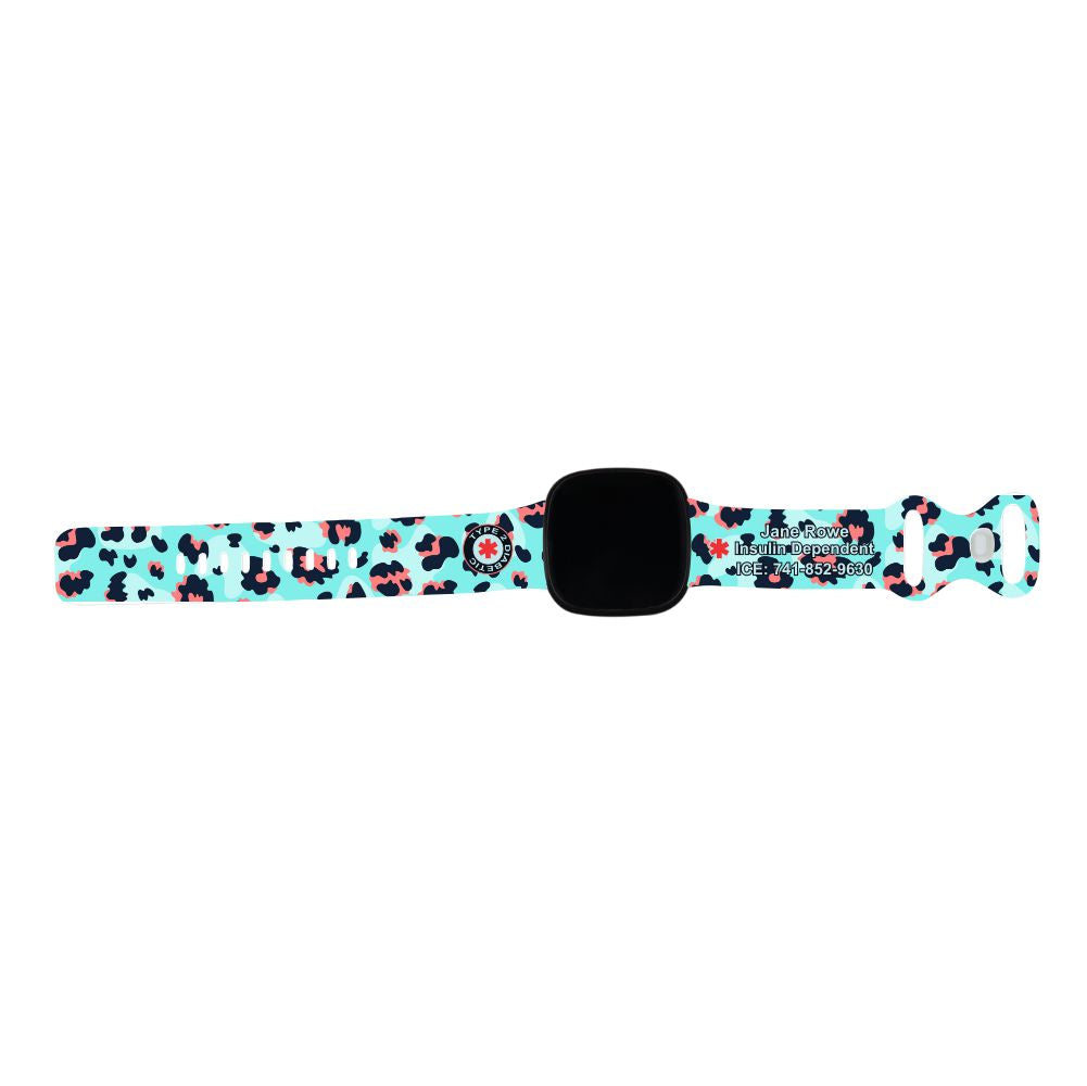 Personalized Medical Alert Watch Band for Fitbit Versa 3 & Fitbit Sense (Peach & Blue Leopard)