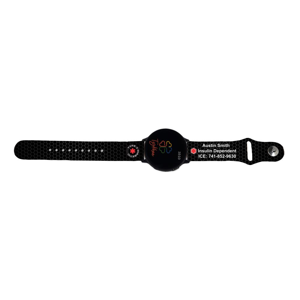 This Personalized Medical Alert band is compatible with the Samsung, Garmin, Verizon Gizmo, and other watches using a 20mm band. Made with high-quality silicone, this watch band is adjustable, comfortable, and super cute.